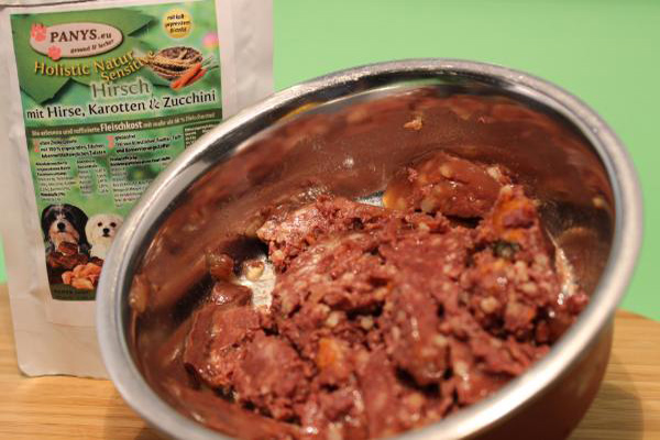 Und hier mal etwas besonderes für Wildliebhaber Das Highlight für viele Hunde mit ernährungsbedingten Problemen, wie weißes Fleisch oder Gluten, mit nur 1 Protein in Form v. 63,0 % Hirsch  und Fleischbrühe 27,0 % vom Hirsch. Dazu kommt 4,0 % Hirse, also eine glutenfrei Rezeptur. Die 2,0 % Zucchini dienen in der tierischen Ernährung als ideale Vitamin-Lieferanten und sind leicht verdaulich. 4,0 % Karotten, enthalten Vitamin A sowie Beta-Carotin und sind für die Augengesundheit wichtig ( :-) oder haben Sie schon einmal einen Hasen mit Brille gesehen?). Wie immer dürfen auch hier die Mineralstoffe und ÖL (hier Distelöl) nicht fehlen. Die Pouchbeutel sind sehr beliebt weil man sie auch für unterwegs bequem mitnehmen kann, einfach aufreißen und rein ins Näpfchen. Sollte mal kein Näpfchen zur Hand sein, frisst so mancher Hund auch gleich aus dem Beutel. Da in den Beuteln eine eingearbeitete Brühe ist, hat Ihr Liebling auch gleich noch die notwendige Flüssigkeit, besonders für alle die wenig saufen gut geeignet. Wenn man dann noch den Beutel mit Wasser ausspült, schmeckt dem Hund das Trinkwasser nochmal so gut. Wenn alles erledigt ist, einfach den Pouchbeutel zusammen rollen und ab in den Müll, so hat man wenig Müll und vor Allem keinen lästigen Dosenmüll. Alle PANYS Menüs im Pouchbeutel gibt es in 100 g und 300 g und sind als Alleinfuttermittel für ausgewachsene Hunde zugelassen. Mit wenigstens 60,0 % Fleischanteil und ohne Zuckerzusatz, sind es ernährungsphysiologisch ausgewogene Rezepturen. Optimale Lagerung:  7° bis 20° C