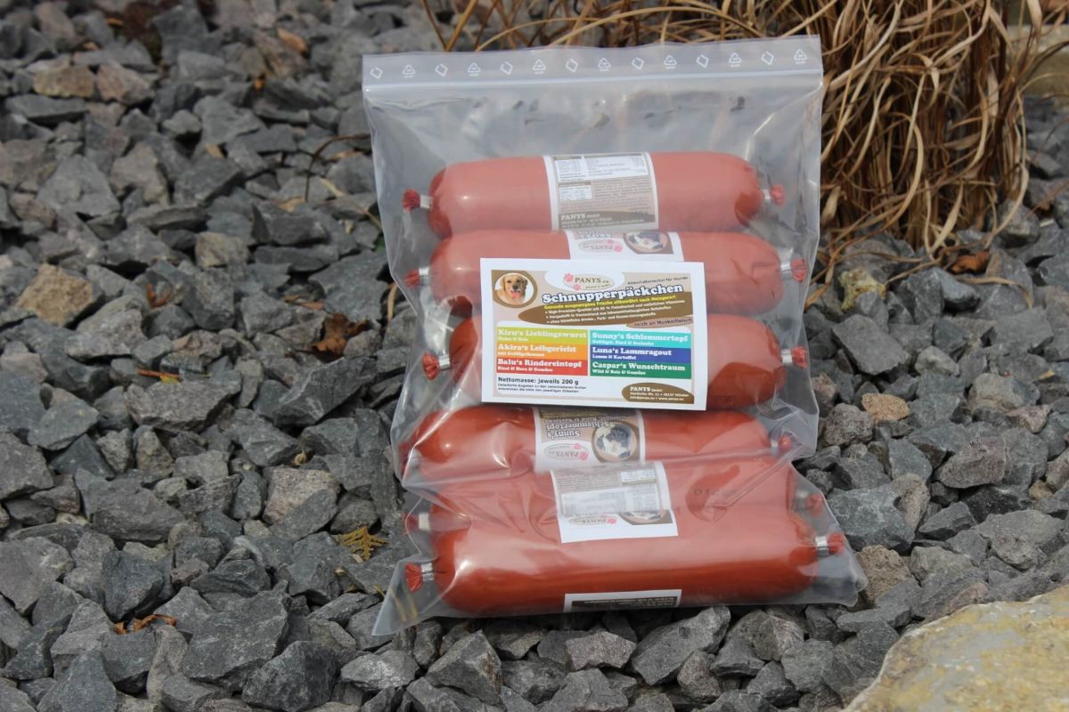 6 Sorten Hundewurst von insgesamt 15 Sorten je in der gewählten Größe zum ausprobieren (siehe Zusammensetzung) in der gewählten Gewichtsklasse.